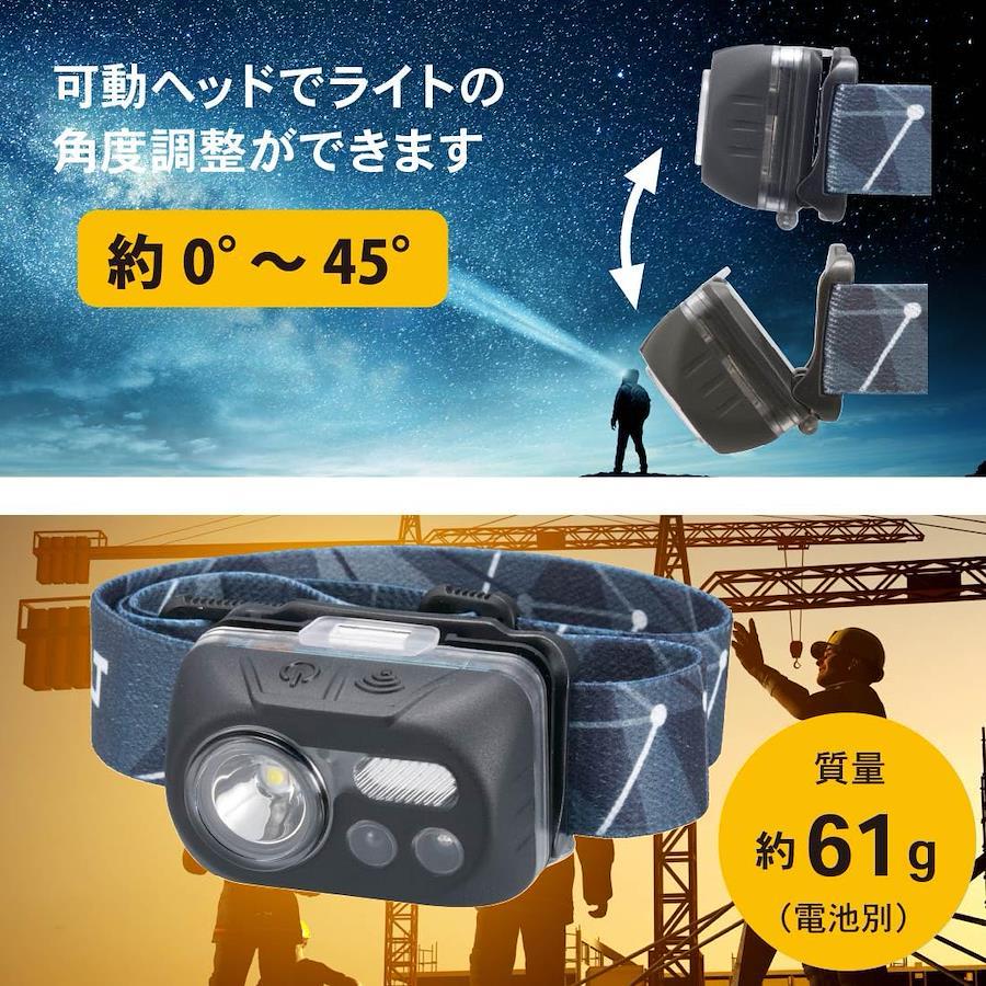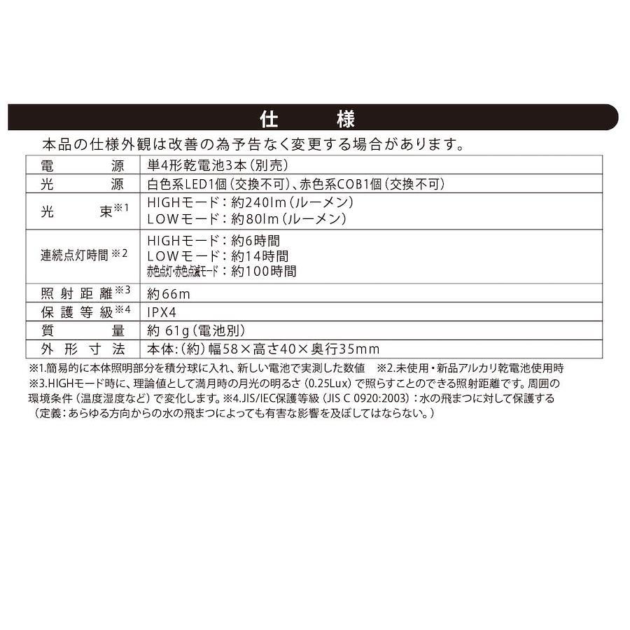 ●商品詳細は、取扱説明書または、商品パッケージ等に記載の注意書きをご参照ください。【 特 長 】 ◆手をかざすと自動で点灯・消灯するモーションセンサースイッチ搭載 ◆アウトドアや作業に便利、手が汚れた状態でも点灯・消灯がラクラク ◆赤色点灯と赤色点滅機能付き ◆HIGH/LOWの2段階調光 ◆モーションセンサー中に調光可能◆ヘッド部角度調整可能 ◆落下耐性1m ◆照射距離約66m ◆連続点灯約6~14時間【 仕 様 】 ◆電源:単4形乾電池3本(別売) ◆光源:白色系LED1個(交換不可)、赤色系COB1個(交換不可) ◆光束:HIGHモード…約240 lm(ルーメン)、LOWモード…約80 lm(ルーメン) ◆連続点灯時間:HIGHモード…約6時間、LOWモード…約14時間、赤色点灯・赤色点滅モード…約100時間◆照射距離:約66m ◆保護等級:IPX4(防まつ形…水の飛まつに対して保護する。あらゆる方向からの水の飛まつによっても有害な影響を及ぼしてはならない。※JIS C 0920:2003による) ◆質量:約61g(電池別) ◆外形寸法:(約)幅58×高さ40×奥行35mm