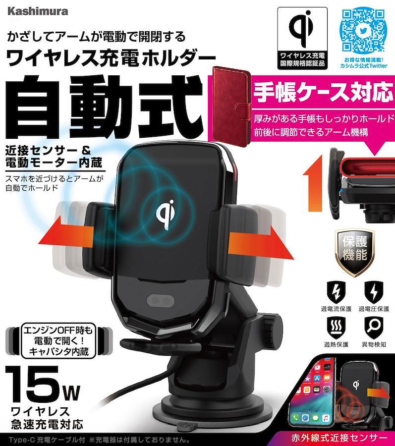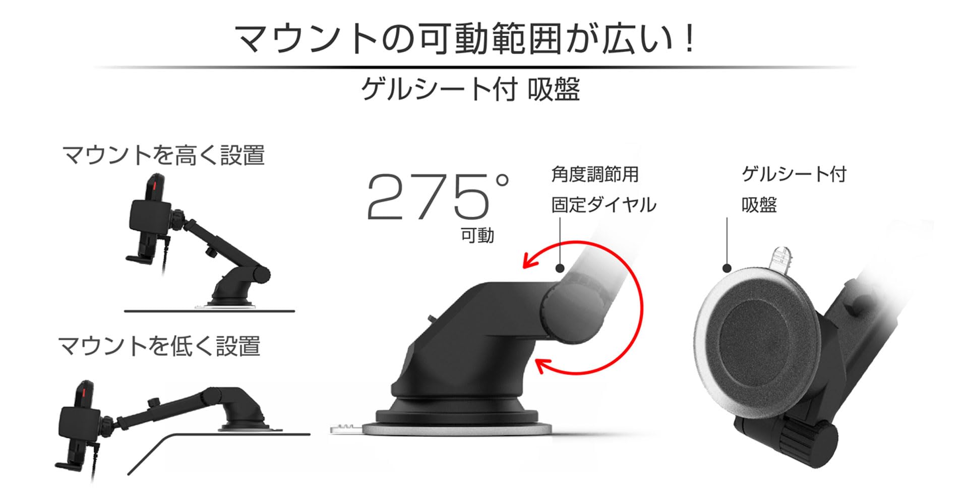 ●ワイヤレス充電対応のiPhone/スマートフォンを置くだけで充電できるワイヤレス充電器。●ワイヤレス充電の規格「Qi」認証品。●スマホ/iPhoneをかざすだけで自動でアームが開閉。●赤外線式近接センサー搭載、センサーのON/OFF切替えができる。●エンジンOFFの状態でも電動でアームが開閉可能なキャパシタ内蔵。●強い吸着力を維持するレバー付吸盤マウント。●伸縮式の調節アーム採用。●ボールジョイントで、取り付け後も360°見やすい位置に角度調整が可能。●スマートフォンケースの厚みに合わせてアームのグリップ部分を手動で前後に調節可能。●最大10Wの急速充電対応。 (急速充電には対応機器とQuick Charge 2.0以上の充電器が必要です。)●通電状況が分かるLED付き。 (赤点灯:待機時/青点灯:充電時/赤点滅:異常時)●USB電源ケーブル付き。●安全・安心の保護機能付き。過電流保護、過電圧保護、過熱保護、異物検知保護。