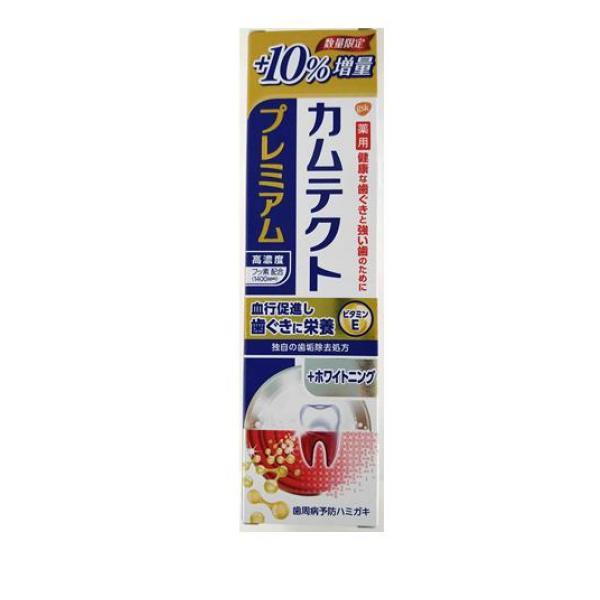 製品の特徴●カムテクトは独自の処方で、エクストラファインパウダー(炭酸水素ナトリウム;清掃剤)約70%配合で歯垢を除去します。●イソプロピルメチルフェノール(IPMP)がバクテリアを殺菌、グリチルリチン酸モノアンモニウム(MAG)が炎症を抑え、歯周病を予防します。●さらに、高濃度フッ素(フッ化ナトリウム)が歯を強くしムシ歯を予防します。●独特な薬用感のある味がしますが、継続してご使用いただくと、多くの方がカムテクトの味を好まれるようになり、スッキリした使い心地をお楽しみいただけます。●歯垢除去と歯ぐきの血行を促進し、栄養を届けるビタミンEを配合した歯周病予防ハミガキです。