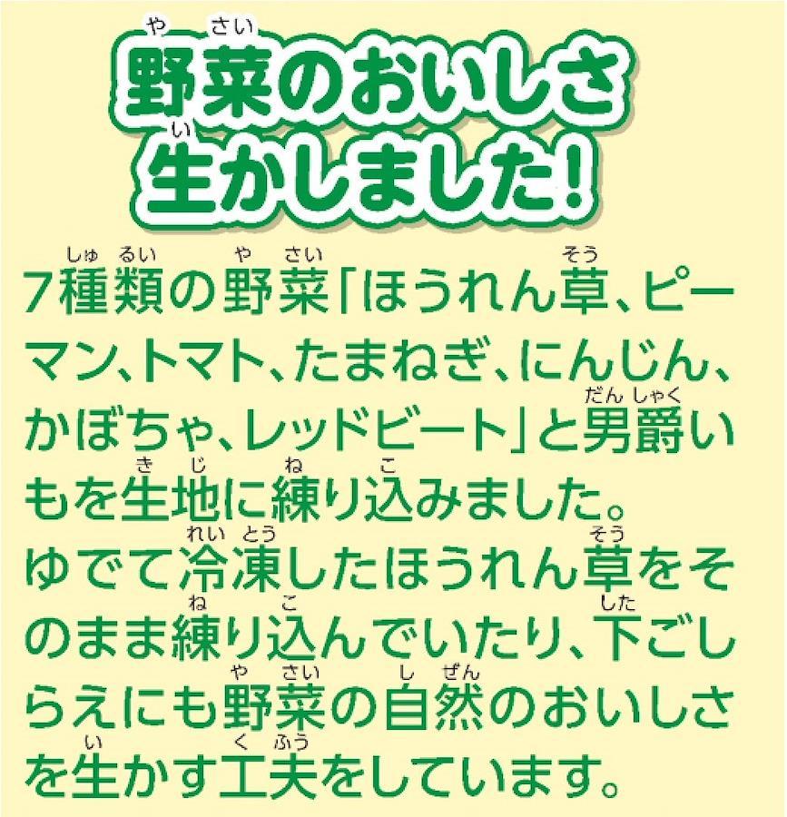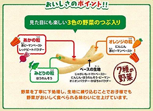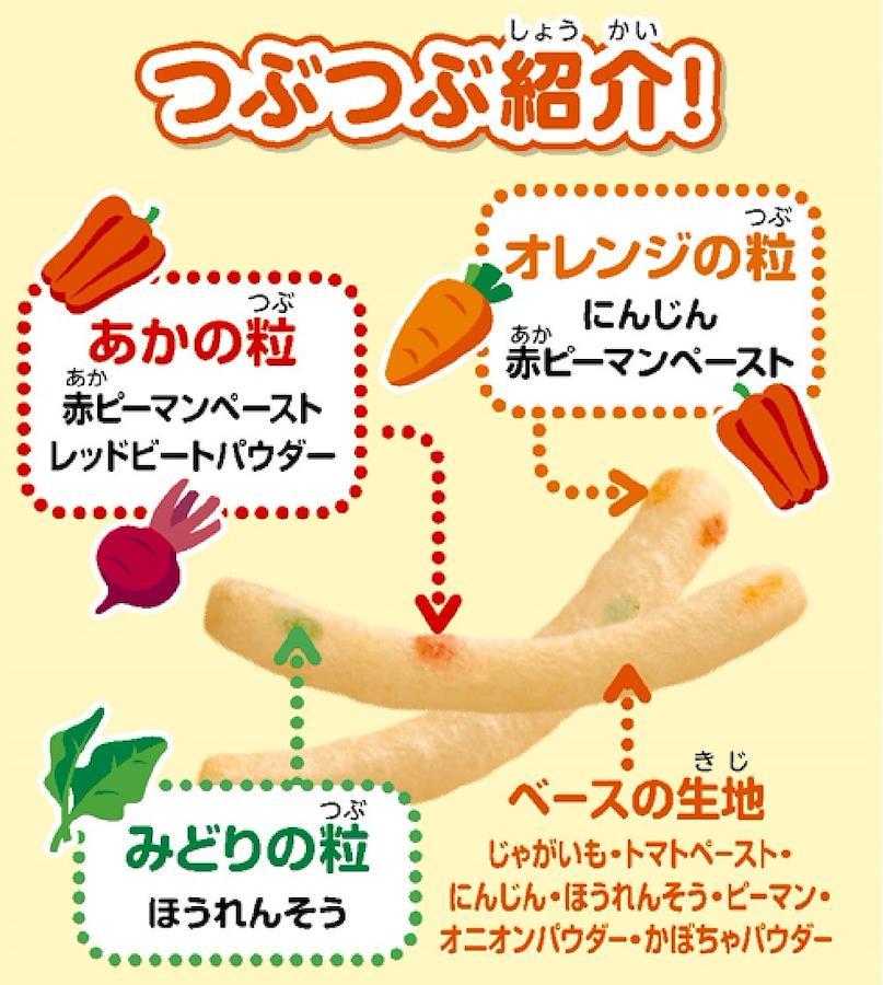 小麦粉、植物油、じゃがいも(遺伝子組換えでない)、じゃがいもでん粉、乾燥じゃがいも、コーンスターチ、砂糖、ほうれんそう、食塩、上新粉、にんじん、ピーマン、かぼちゃパウダー、トマトペースト、オニオンパウダー、赤ピーマンペースト、レッドビートパウダー、たん白加水分解物/調味料(アミノ酸等)、トレハロース、pH調整剤、甘味料(甘草)