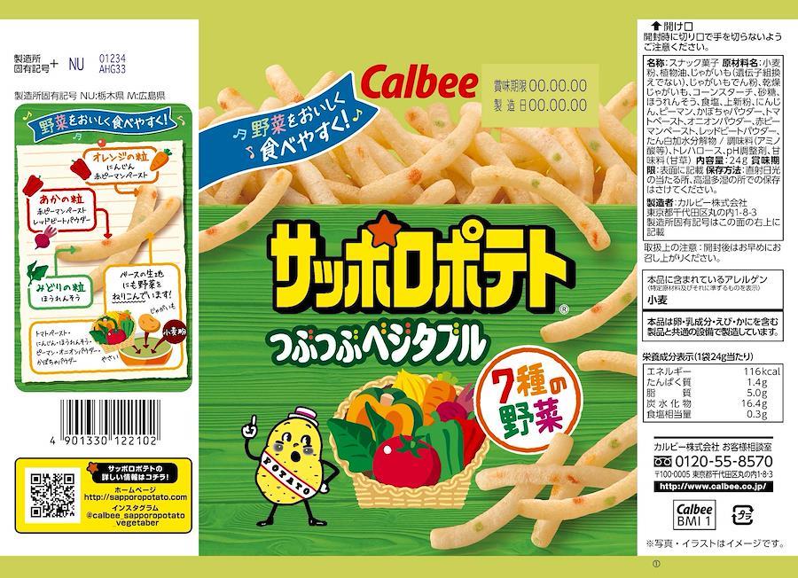 じゃがいも+野菜の"おいしさ"を強化して「サッポロポテトつぶつぶベジタブル」がリニューアルしました。子供が大好きなじゃがいも"生馬鈴薯"は、男爵いもを100%使用しました。7種類の野菜と男爵いも100%であっさりとした味わい。“野菜のつぶつぶ"が見えるスナックです。
