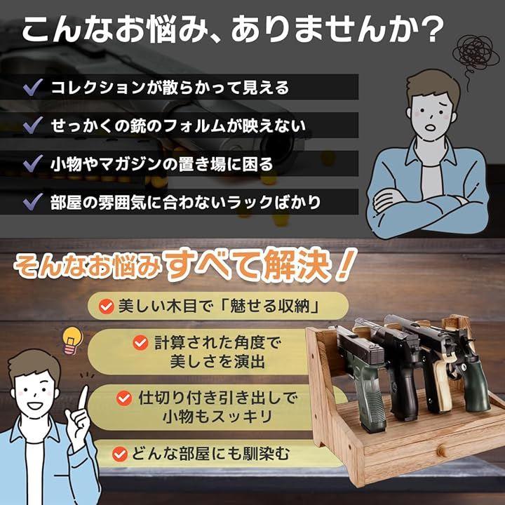 モダンなポリマーフレームオートから、クラシックなリボルバーまで、最大4丁のコレクションが互いを引き立てあい、一つのアートピースとして完成された空間を演出します。