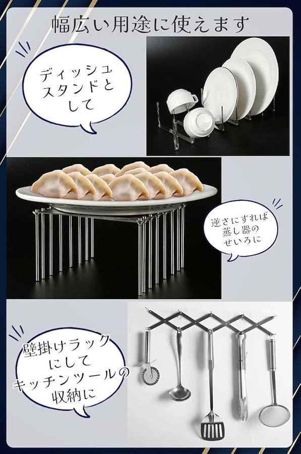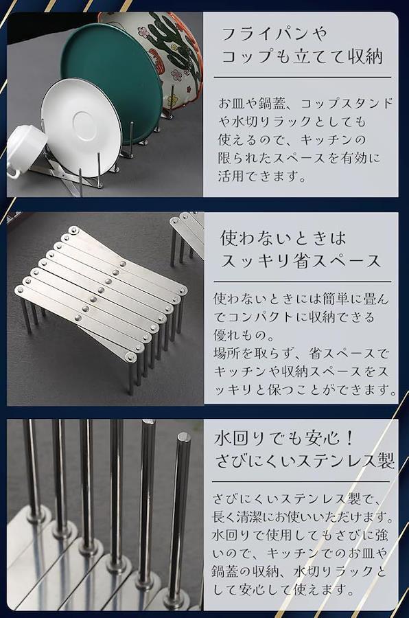 「サイズ調節自在」どんなキッチンにもマッチする、伸縮自在のディッシュスタンド。場所を取らない折り畳み式で、使わない時はサッと片付けられます。