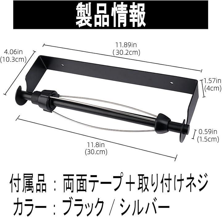 「製品情報」キッチンペーパーホルダー カラー:ブラック・黒 シルバー・銀 サイズ:302mmx103mmx40mm 付属品:両面テープ+取り付けネジ