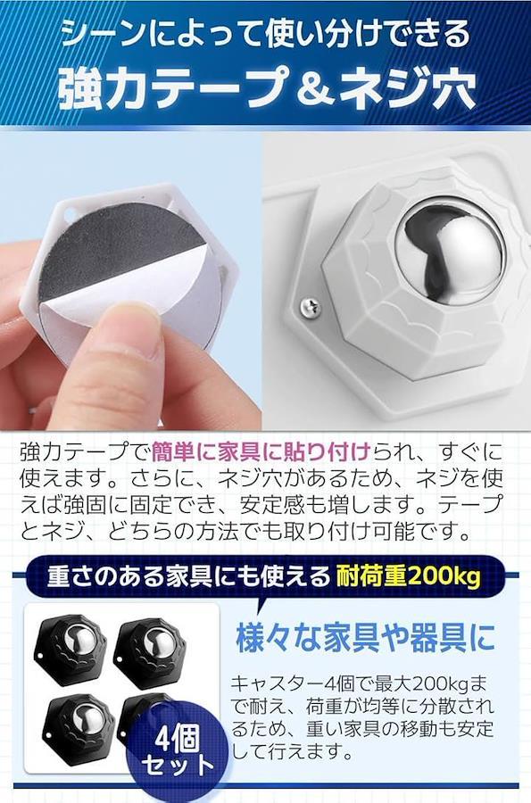 「様々な家具や器具に」キャスター4個で最大200kgまで耐え、荷重が均等に分散されるため、重い家具の移動も安定して行えます。