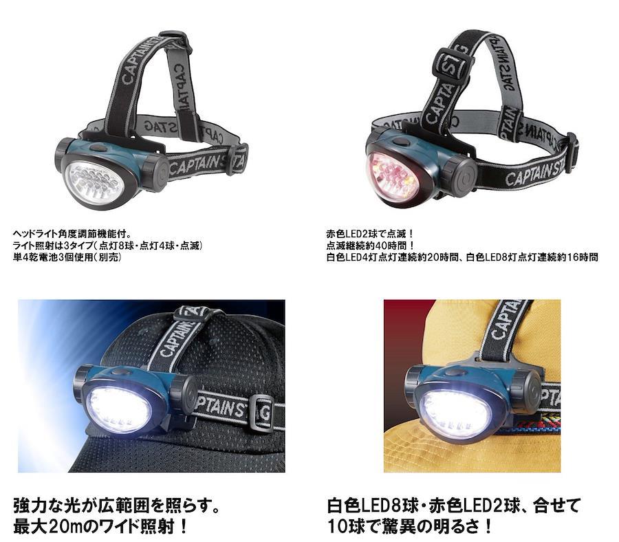 強力な光が広範囲を照らす最大20mのワイド照射!装着した後、装着場所に合わせ角度調節機能付白色LEDが8球、赤色LEDが2球、合わせて10球で驚異の明るさ点灯(8球 連続16時間)・点灯(4球 連続20時間)・点滅(赤色LED2球 40時間)ライト照射は3タイプ単4系乾電池3個使用(別売)原産国:中国製品サイズ:(約)本体/幅85×奥行57×高さ46mm製品重量:(約)70g(乾電池含まず)材質:本体/ABS樹脂、レンズ/ポリカーボネート、バンド/ナイロン仕様:光源/LED(発光ダイオード)10個(白8・赤2)、電源/DC4.5V単4乾電池3個(別売)、電池寿命/4球・約20時間、8球・約16時間、赤色点滅・約40時間※使用状況により異なりますご注意:レンタル等による貸出、オークション等による販売や中古販売、及び譲渡によって発生した故障・破損・損害・事故などにつきましては一切責任を負いかねますので予めご了承ください