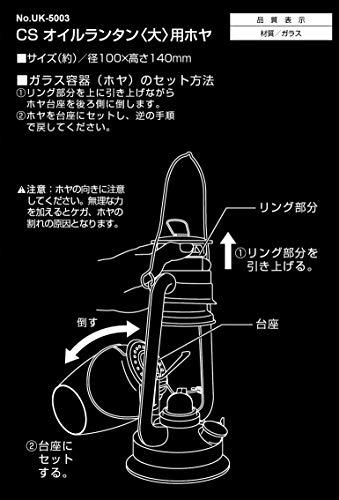 レンタル等による貸出、オークション等による販売や中古販売、及び譲渡によって発生した故障・破損・損害・事故などにつきましては一切責任を負いかねますので予めご了承ください。製品サイズ:(約)径100×高さ140mm対応商品:UK-507/CSオイルランタン大(ブロンズ)材質:ガラス原産国:中国