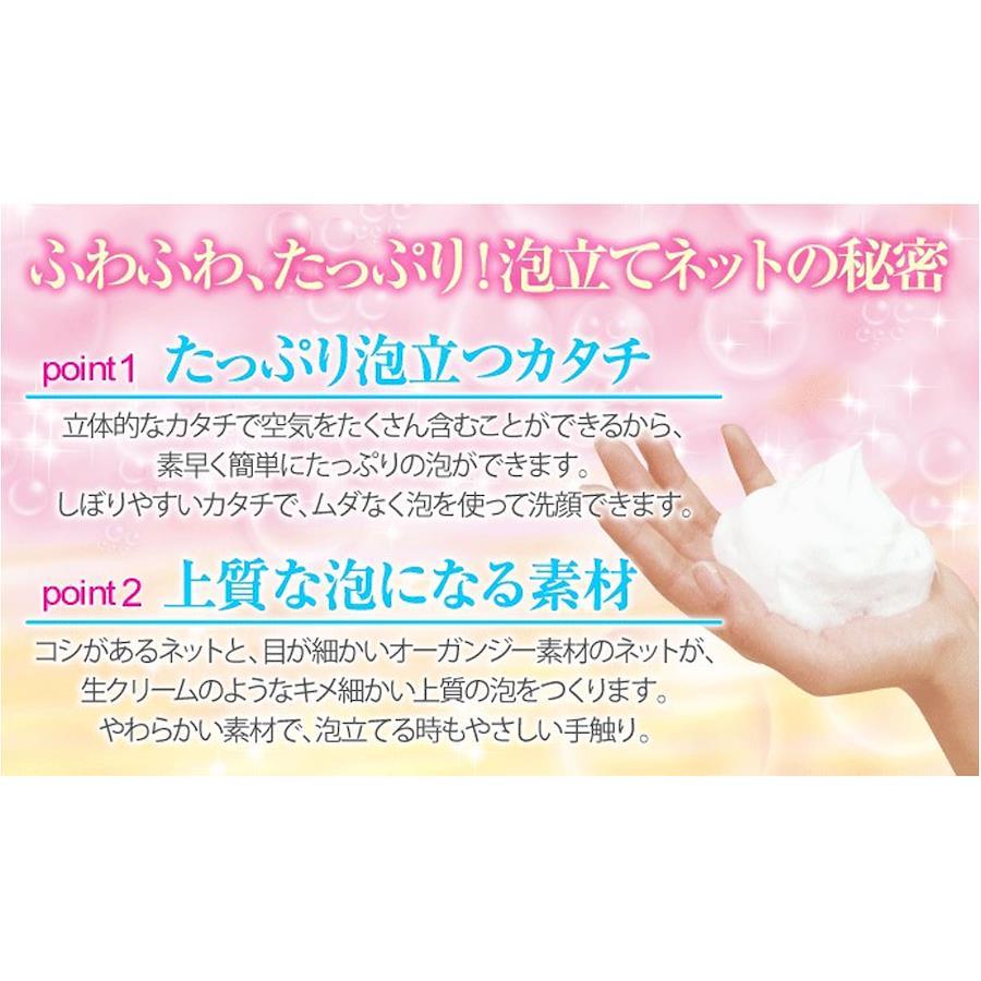 きめ細かい生クリームのような上質な泡で洗顔♪泡立つオーガンジー素材。●たっぷり泡立つカタチ立体的なカタチで空気をたくさん含むことができるから、素早く簡単にたっぷりの泡ができます。しぼりやすいカタチで、 ムダなく泡を使って洗顔できます。●上質な泡になる素材コシがあるネットと、目が細かいオーガンジー素材のネットが、生クリームのようなキメ細かい上質の泡をつくります。やわらかい素材で、泡立てる時もやさしい手触り。