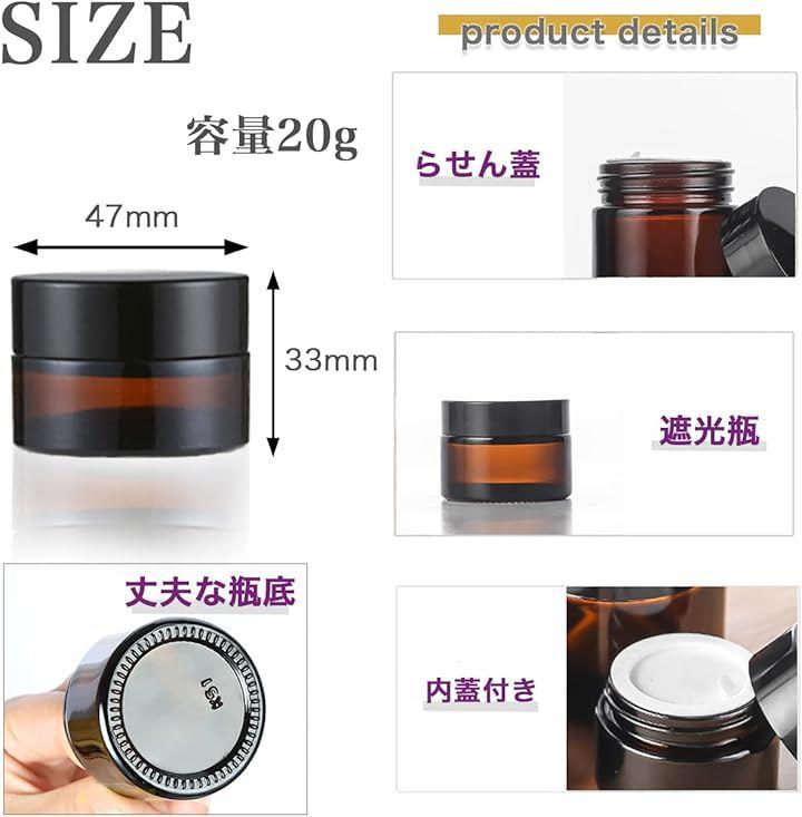 「商品内容」本体:20個入 容量:20g サイズ:直径47mm、高さ33mm カラー:ブラウン 材質:ガラス、ABS 付属:ハンドプル付きガスケット(中蓋) *自社にて検品はしっかり行なっておりますが、どうしても製造上の都合で外蓋に小傷等ができてしまう場合がございます。