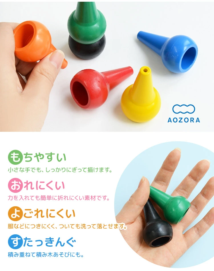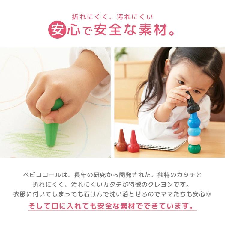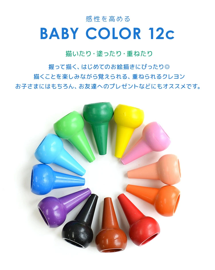 【ベビコロール】ペンが持てなくても描ける!始めてのお絵描きにぴったりのベビコロール12色セット。永年の研究から開発された子供たちの手にフィットしやすいカタチと折れにくく汚れにくいのが特徴。クレヨンながらも積み重ねることも出来るので積み木としても遊べそう♪原材料には子供たちが使うものですから安全で安心な素材を使用しています◎また、服などについてしまっても石けんで洗い落とせるので、めいいっぱいお絵描きを楽しめます♪