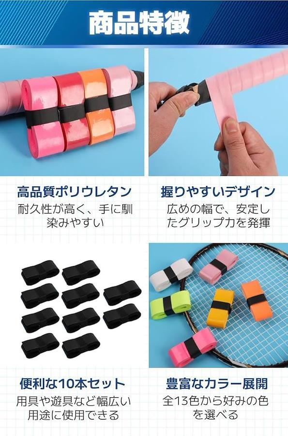 「商品特徴」(1)高品質ポリウレタン:耐久性が高く、手に馴染みやすい/(2)握りやすいデザイン:広めの幅で、安定したグリップ力を発揮/(3)便利な10本セット:用具や遊具など幅広い用途に使用できる/(4)豊富なカラー展開:全13色から好みの色を選べる