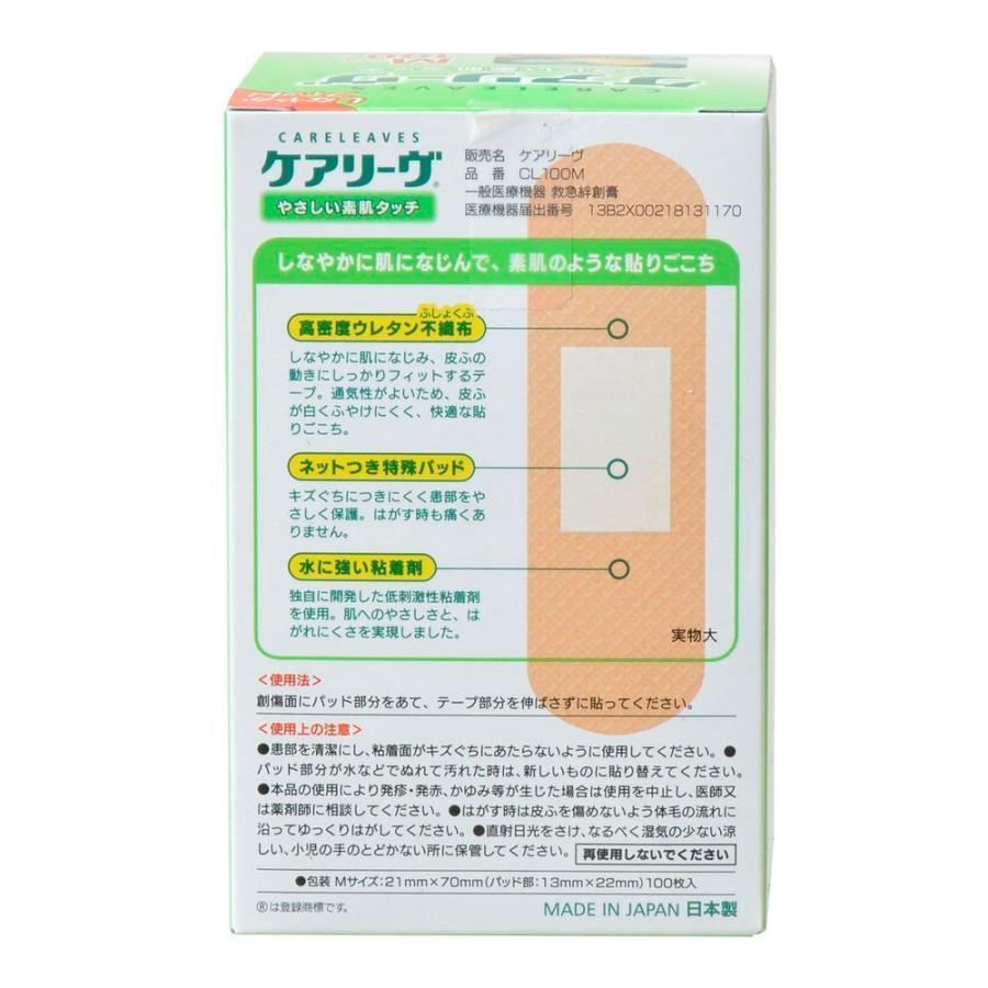 「やわらか素材の高密度ウレタン不織布」「キズぐちにやさしいパッド」「水に強い粘着剤」採用、やさしい素肌タイプの救急絆創膏です。●2分の1の極細繊維から生まれた高密度ウレタン不織布高密度ウレタン不織布(ふしょくふ)」は、従来のウレタン不織布と比べて約2分の1の細さ。このため、きめの細かい美しい仕上がりとなっています。また、たいへん柔軟性にすぐれ、全方向にほぼ均一に伸びるため、皮ふのどんな動きにもしなやかにフィット。さらにテープ全体にエンボス(凹凸)を施すことにより、表面の滑り性を皮ふの滑り性に近づけました。これらの素材特性が、肌へのなじみのよさと違和感のない快適な貼りごこちを実現しています。●指まわりや屈曲部にしっかりフィット高密度ウレタン不織布はタテヨコの伸びがすぐれており、指を動かしたり、曲げたりしてもしっかりフィットしています。また皮ふの微妙な動きに追従するため、皮ふへのストレスを軽減。かぶれにくく、やさしい貼りごこちです。●透湿性がよく、皮ふのムレが少ない透湿性にすぐれた高密度ウレタン不織布と粘着剤設計により、皮ふのムレが少なく、白くふやけたりすることがほとんどありません。●角質細胞のはがれが少ない低刺激性粘着剤はがす時、皮ふ表面の角質細胞がはがれることも皮ふ刺激の原因の一つです。 ケアリーヴTMは角質細胞のはがれを抑えることにより、貼り替えによる刺激も低減しました。●丈夫で強度のある個別包装紙は、携帯してもヨレが少なく、気持ちよく使えます。●パッドへ触れずに貼れる、清潔設計セパレーターを採用。