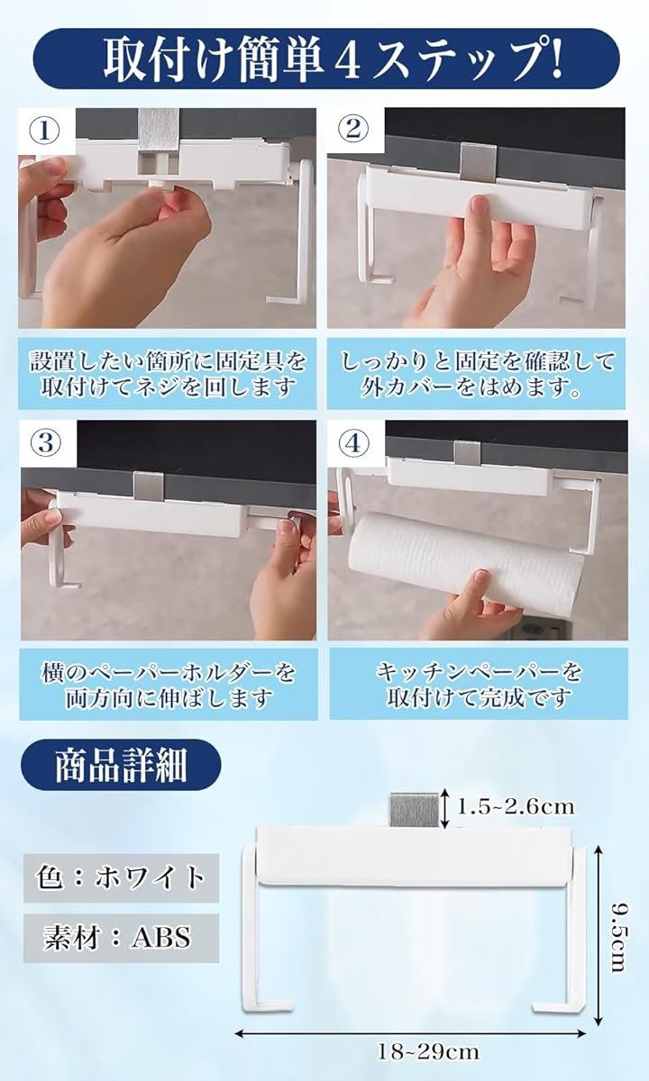 吊るすだけで簡単設置。 ネジでの穴あけや両面テープ不要で、キッチン棚やキャビネットに引っ掛けるだけ。