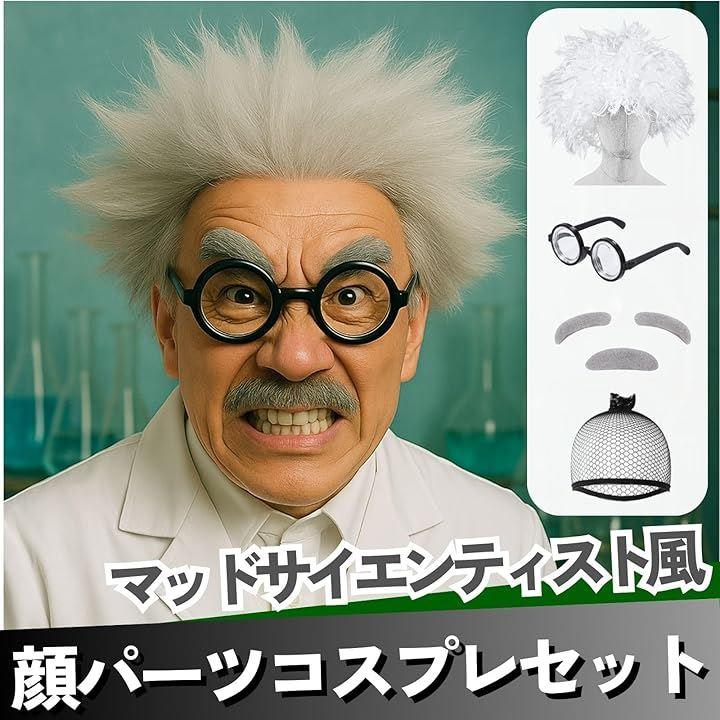 眉パーツや髭を貼って、眼鏡やメガネをかければ、アインシュタイン風や科学者に早変わり。仮装やパーティー、学園祭、イベントでのcosプレにも最適。