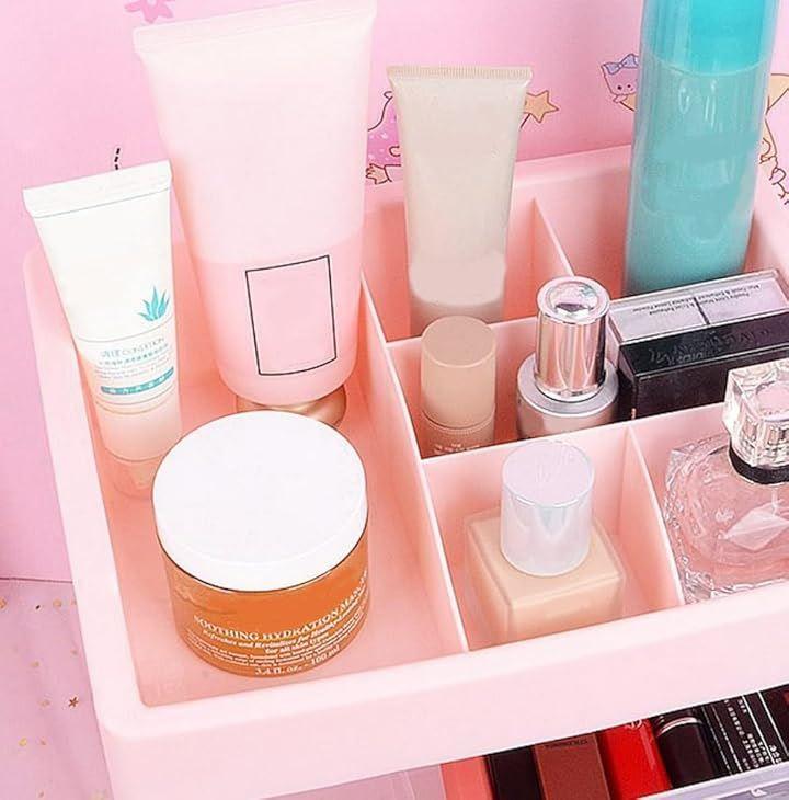 スキンケア製品、口紅、マニキュア、アイライナー、ネイルカラー、メイクブラシ、チーク、アイブロウ、スティックファンデーション、美容グッズ、ネックレスや指輪など、その他いろいろな小物、コスメ用品を収納できます。
