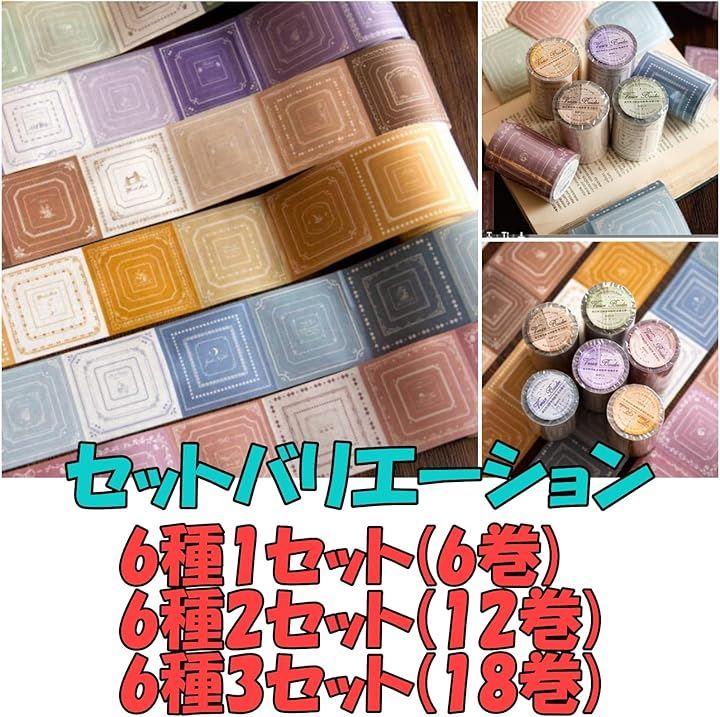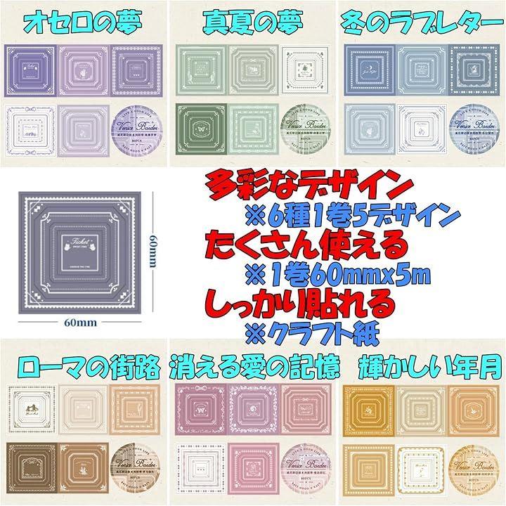 「サイズ」1枚約60mmx60mm、1ロール約60mmx5m 480枚 「セット」1セット:6ロール6種類 1種類5デザイン 「バリエーション」1セット、2セット、3セット 「カラー」ヴェネツィア風、ボーダー柄 「素材」クラフト紙 「特徴」1枚で4通りの使い方