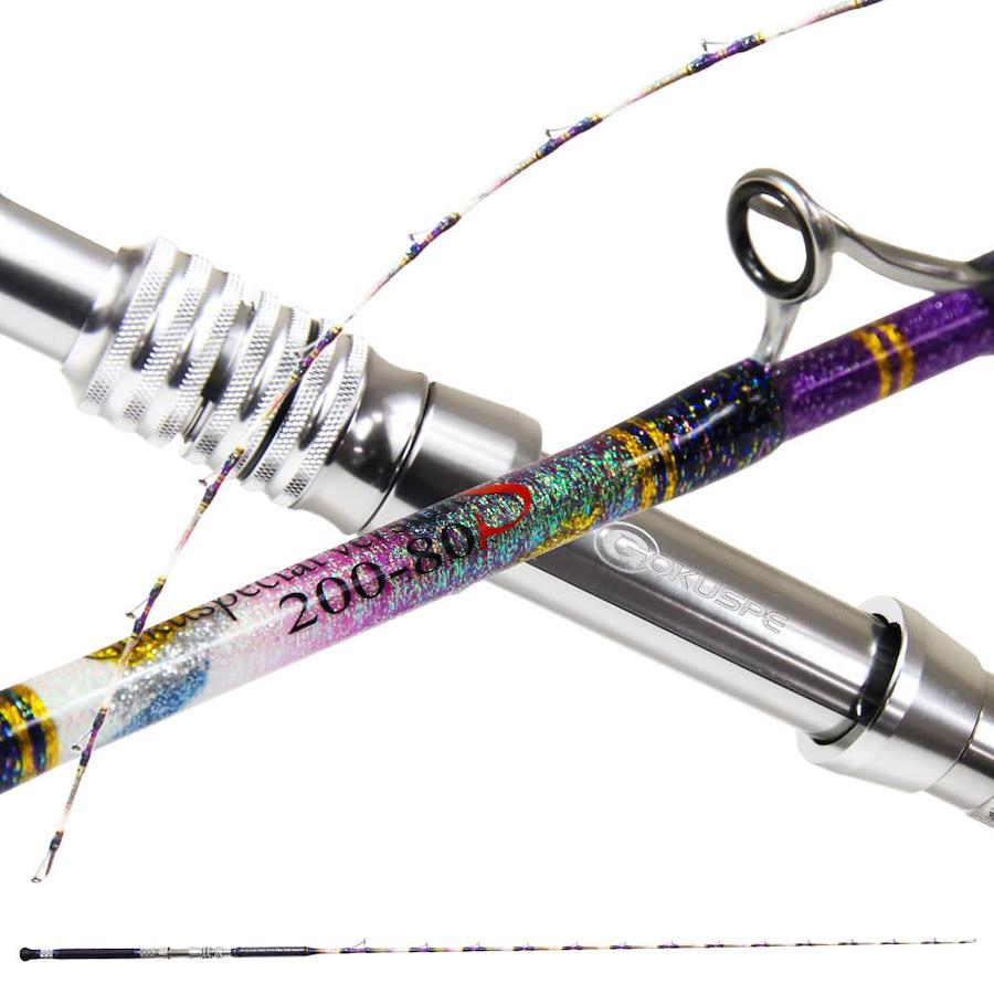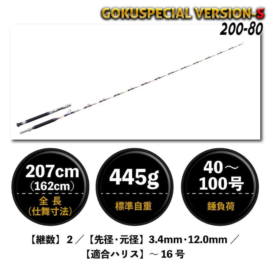 品番:200-80全長:207cm●継数:2本●仕舞寸法:約162cm自重:445g先径/元径 (トップ期):3.4mm/12.0mm錘負荷:40~100号●ハリス/ライン:~16号
