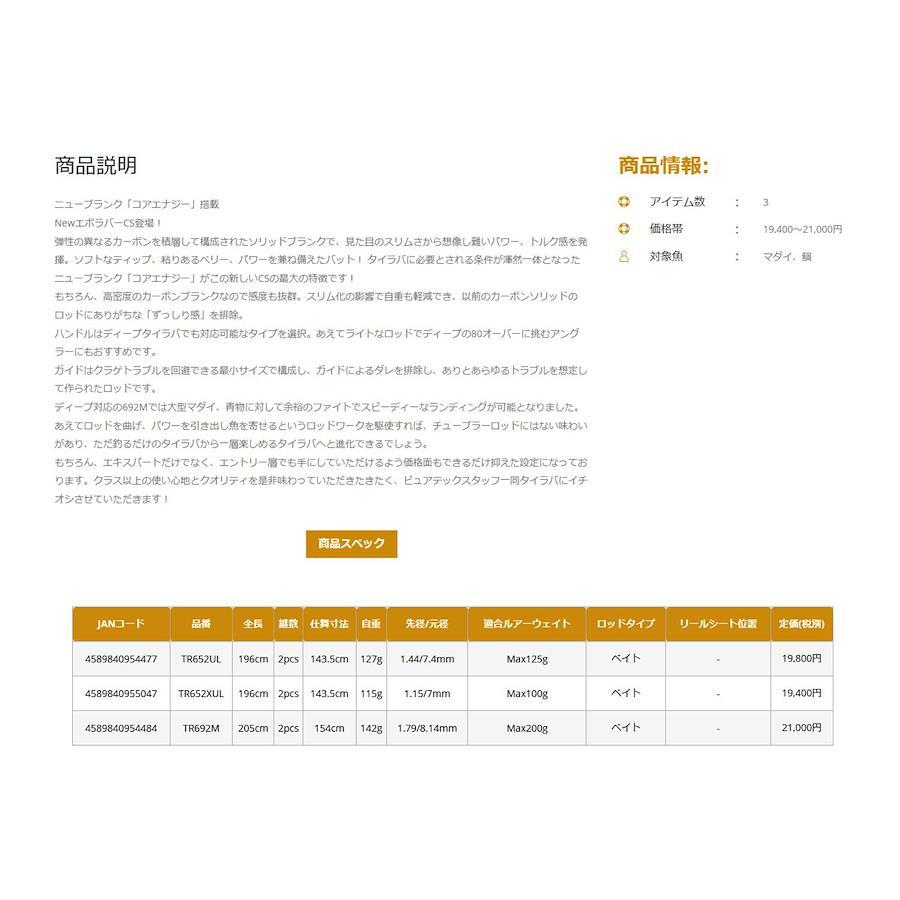 ニューブランク「コアエナジー」搭載NewエボラバーCS登場弾性の異なるカーボンを積層して構成されたソリッドブランクで、見た目のスリムさから想像し難いパワー、トルク感を発揮。ソフトなティップ、粘りあるベリー、パワーを兼ね備えたバット!タイラバに必要とされる条件が渾然一体となったニューブランク「コアエナジー」がこの新しいCSの最大の特徴です!もちろん、高密度のカーボンブランクなので感度も抜群。スリム化の影響で自重も軽減でき、以前のカーボンソリッドのロッドにありがちな「ずっしり感」を排除。ハンドルはディープタイラバでも対応可能なタイプを選択。あえてライトなロッドでディープの80オーバーに挑むアングラーにもおすすめです。ガイドはクラゲトラブルを回避できる最小サイズで構成し、ガイドによるダレを排除し、ありとあらゆるトラブルを想定して作られたロッドです。ディープ対応の692Mでは大型マダイ、青物に対して余裕のファイトでスピーディーなランディングが可能となりました。あえてロッドを曲げ、パワーを引き出し魚を寄せるというロッドワークを駆使すれば、チューブラーロッドにはない味わいがあり、ただ釣るだけのタイラバから一層楽しめるタイラバへと進化できるでしょう。もちろん、エキスパートだけでなく、エントリー層でも手にしていただけるよう価格面もできるだけ抑えた設定になっております。クラス以上の使い心地とクオリティを是非味わっていただきたきたく、ピュアテックスタッフ一同タイラバにイチオシさせていただきます!