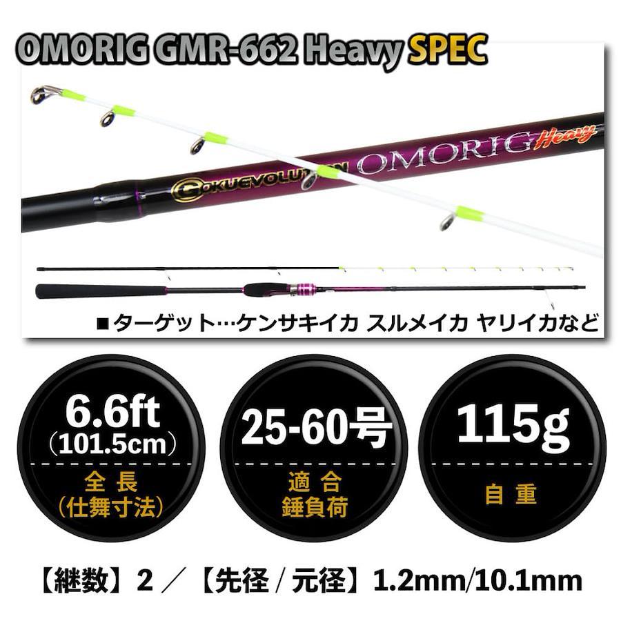 「キャスト・アクション・フッキング」というオモリグの釣りに必要な性能を高次元で備える従来モデル(GMR-632)の利点はそのままに、60号のヘビーなオモリまで対応可能な1本。高感度設計で微細なイカのアタリもしっかりと感知。そのうえで胴部分の強化により負荷がかかったときにはしっかりと残る設計となっています。また、リアグリップを長めに設計しているので脇挟みの状態でロッドを操作することができるなど、あらゆる面でヘビーなオモリを用いたオモリグの釣りに対応するモデルです。