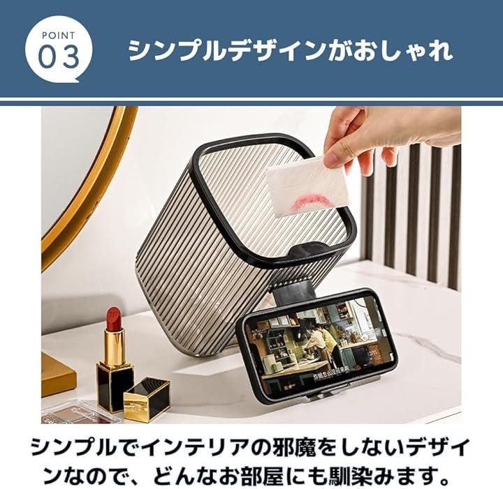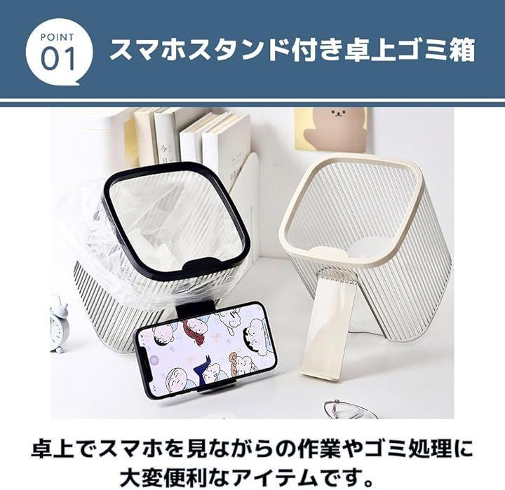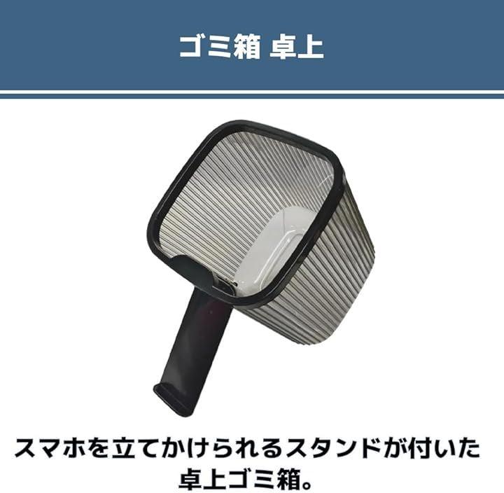 「スマホスタンド付き卓上ゴミ箱」スマホを立てかけられるスタンドが付いた、卓上ゴミ箱。