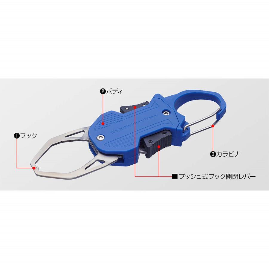 小型回遊魚やロックフィッシュなどのライトゲームフィッシュ専用コンパクトフィッシュグリップ「GMグリップミニ LT」は、簡単操作で魚の口をしっかりホールドします。ボディ素材には軽量で錆びない強化プラスチック(GFRP)を採用。さらに、携帯に便利なカラビナを本体と一体化することで、様々な場所にブラブラ感を抑えスッキリ取り付けることができます。