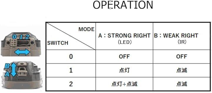 「操作方法」 〇0:OFF〇1:グリーンライト点灯〇2:グリーンライト点灯+ホワイトライト点滅〇メインスイッチ:IR/可視光切替 「仕様」〇ABS/ナイロン〇65g 「バッテリー」CR123Ax1個(別売) 「色」ブラック(本体)/ ブルー(ライト)