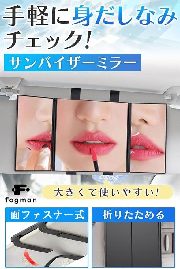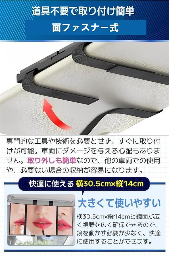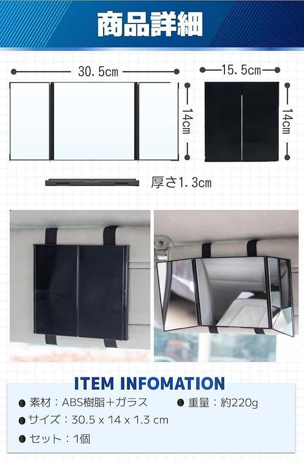 「商品特徴」(1)使いやすい三面鏡:正面、左右と幅広く視野を確保できる/(2)取り付け楽々:面ファスナー式なので取り外しも楽々/(3)コンパクト収納:折りたためるので運転時に邪魔にならない/(4)シックなデザイン:シンプルでどんな車にも馴染みやすい