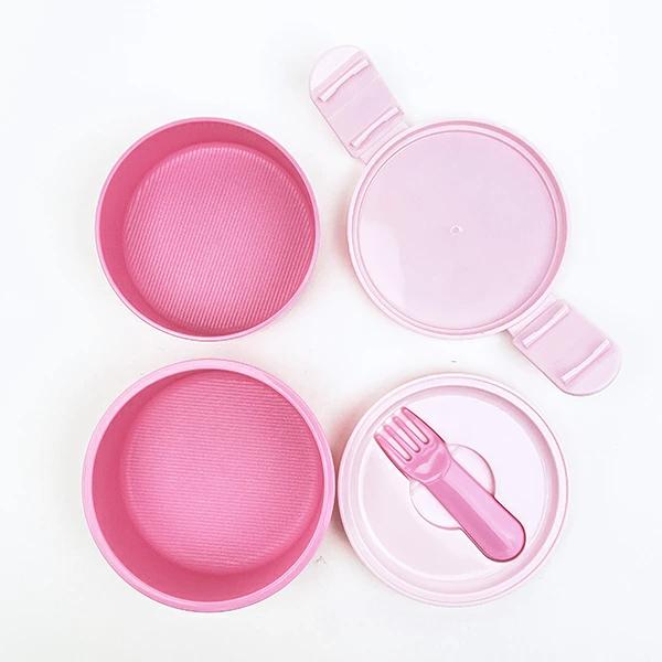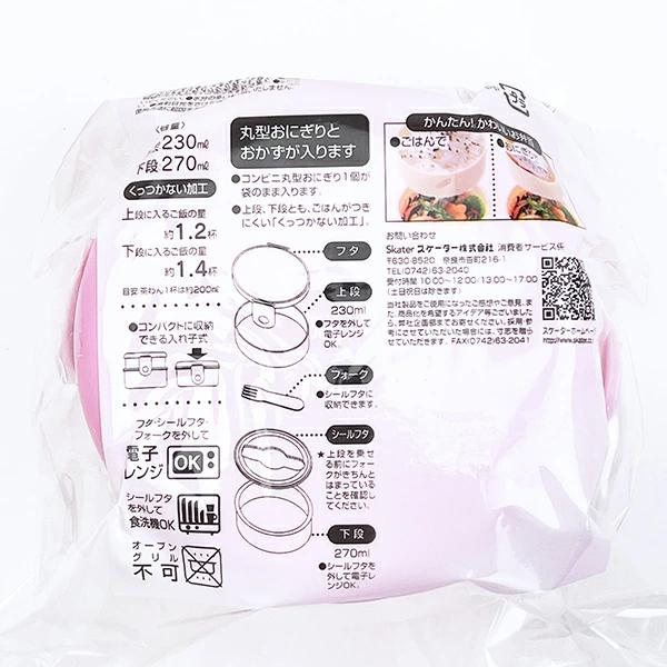 サンリオの小さな丸型のシンプル2段お弁当箱です。コンビニの丸型おにぎり1個が袋のまますっぽり入ります♪上段下段とも、ごはんがつきにくい「くっつかない加工」が施されています。内蓋収納フォーク(プラスチック製)付き。食べ終われば1段にコンパクトに収納できます!※ロック式ですが、パッキンは付いていませんので汁気のある食材はお避け下さい。※フタ・シールフタ・フォークを外して電子レンジOK!電子レンジ使用可◎※食洗機 使用不可!※【容量:上段230ml、下段270ml】