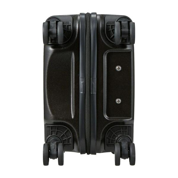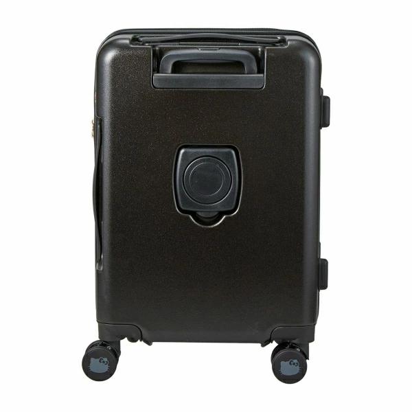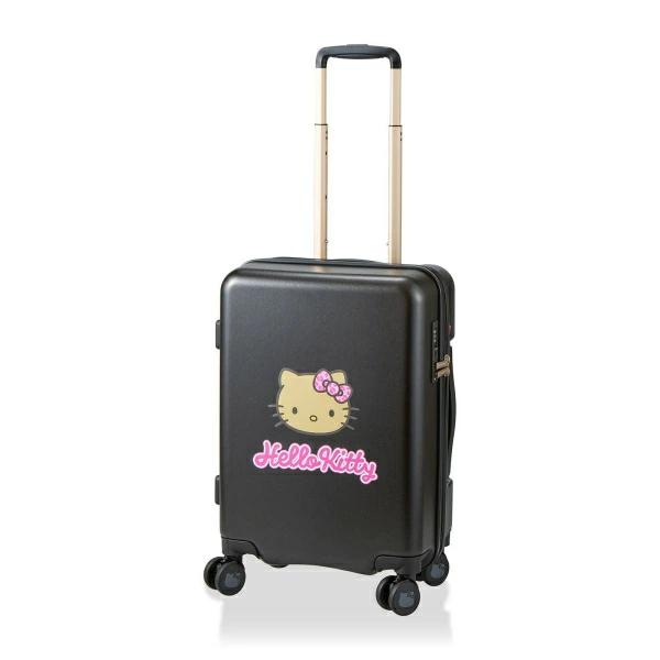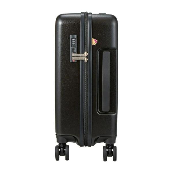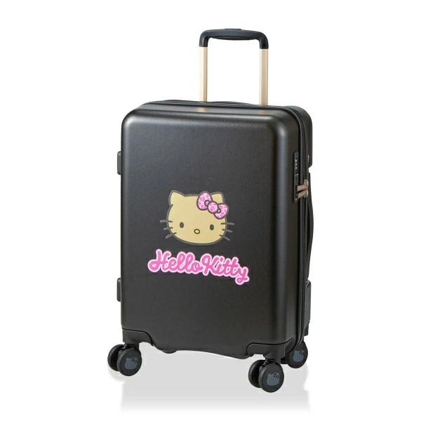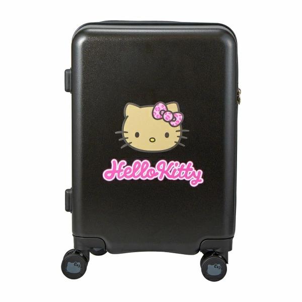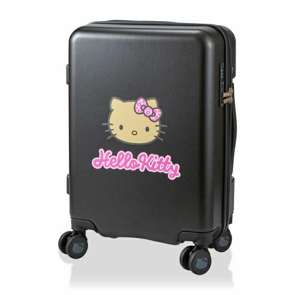 日焼けデザインのハローキティのスーツケース。日焼けデザインのハローキティがピンクのヒョウ柄リボンをつけたお顔がかわいい。スーツケースのブラックのボディに映えるピンクのロゴも大人かわいいデザインです。キャスターにはハローキティのお顔のシルエットが描かれています。スーツケース側面にはひょっこりと覗くハローキティのタグがついており、ファスナートップにはHELLO KITTYロゴが刻印されています。内装はヒョウ柄。細部までこだわったデザインです。デザインだけでなく、実用性も抜群。背面にはカップホルダー付きなのでペットボトル等を簡単に収納してスーツケースを持ち歩くことができます。内装のフタ側の間仕切りはファスナーで閉じられるので、開閉時に荷物がこぼれる心配がありません。胴側はバックル留めの間仕切りとクロスベルト仕様なのでお荷物の荷崩れを防止することができます。キャスターは安定した走行性を発揮するダブルキャスターで機能性も抜群。しかも、サスペンション付きキャスターなので、振動が手に伝わりにくく長時間移動しても疲れにくい!ロックは番号で開閉する『ダイヤルロック』タイプ。さらに、アメリカ方面への旅行時、鍵をかけたまま航空会社に荷物を預けることが可能な『TSロック』も搭載しています。【内寸:H48×W35×D23cm】【重量:約3.1kg】【容量:約33L(宿泊目安:約1~3泊)】