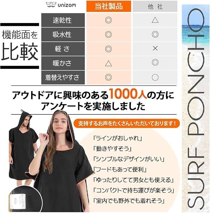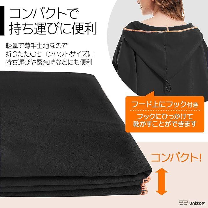 「商品仕様」*サイズ:着丈110cm、幅90cm *カラー:ブラック *素材:マイクロファイバー(ナイロン15%、ポリエステル85%) *重量:400g *用途:海、プール、マリンスポーツの着替えに/キャンプなどのアウトドア時の着替えに/各種レジャーの着替えに/お風呂上がりのバスローブに/防災グッズに *ブランド:unizom