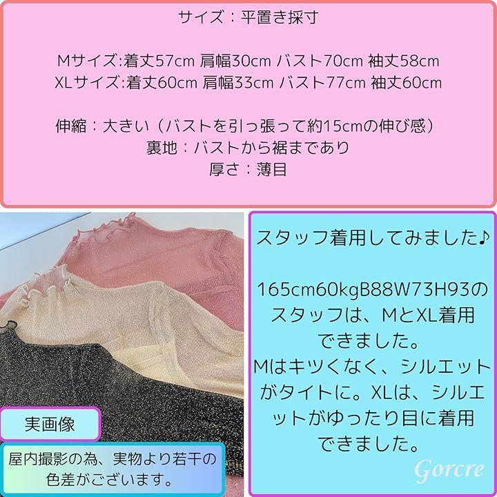 「Mサイズ:着丈57cm 肩幅30cm バスト70cm 袖丈58cm」「XLサイズ:着丈60cm 肩幅33cm バスト77cm 袖丈60cm」「商品内容:シアートップス1点」「主素材:ポリエステル」「裏地:胸下から裾付近まであり」*サイズは平置き採寸です。