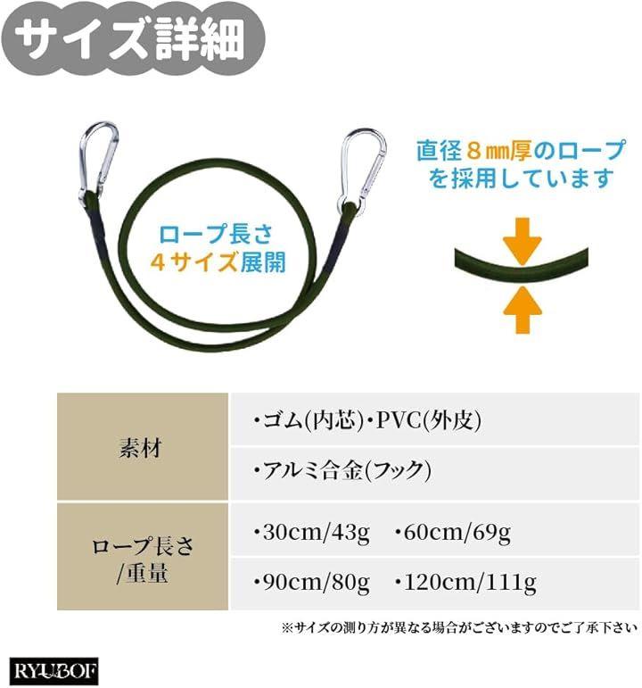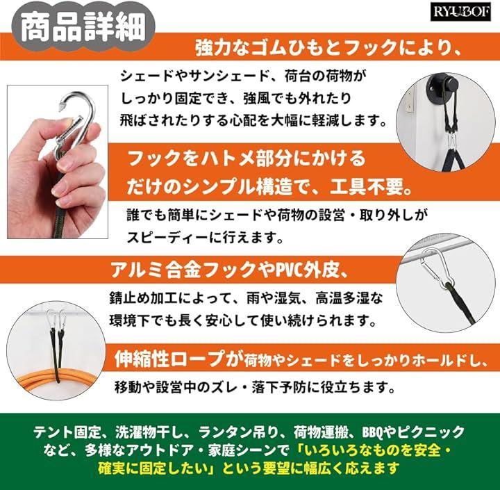 「強力ゴムでしっかり固定」シェードやサンシェード、荷台の荷物にも使える強力なゴムひもは、弾力性が高く揺れや衝撃を吸収し、風が強い屋外や設営時にも安定した固定力が得られます。