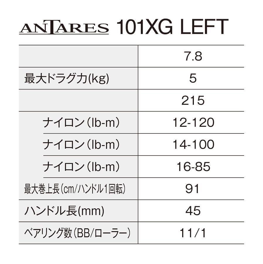 ギア比:7.8 / 最大ドラグ力(kg):5.0 / 自重(g):215スプール 径/幅(mm):37/21糸巻量 ナイロン(lb-m):12-120、14-100、16-85、20-70最大巻上長(cm/ハンドル1回転):91 / ハンドル長さ(mm):45ベアリング数(BB/ローラー):11/1