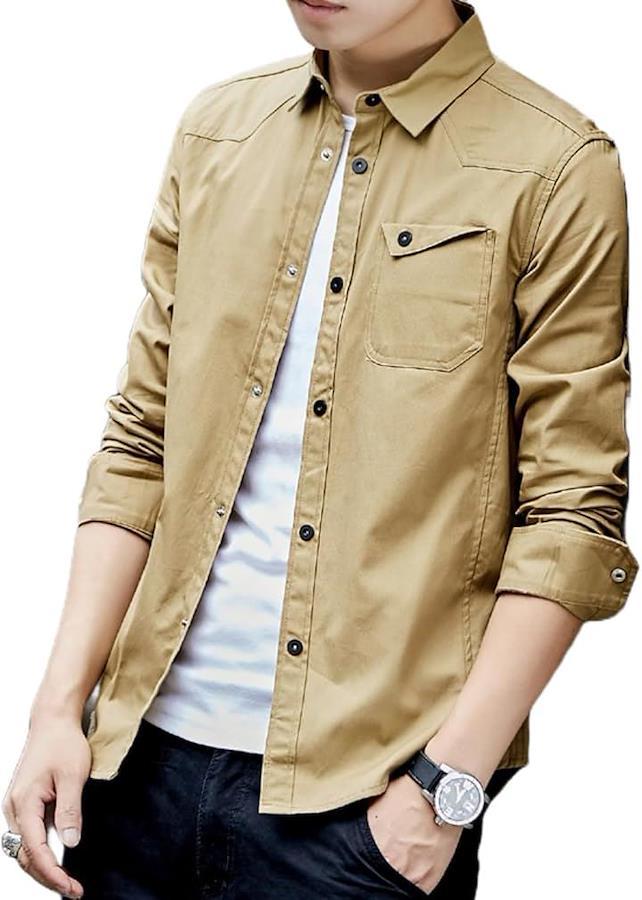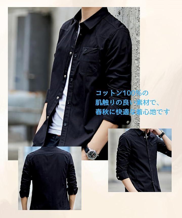 「商品の特徴」コットン100%、長袖、カジュアル、無地、スナップボタン、春秋冬、胸ポケット、前開き。