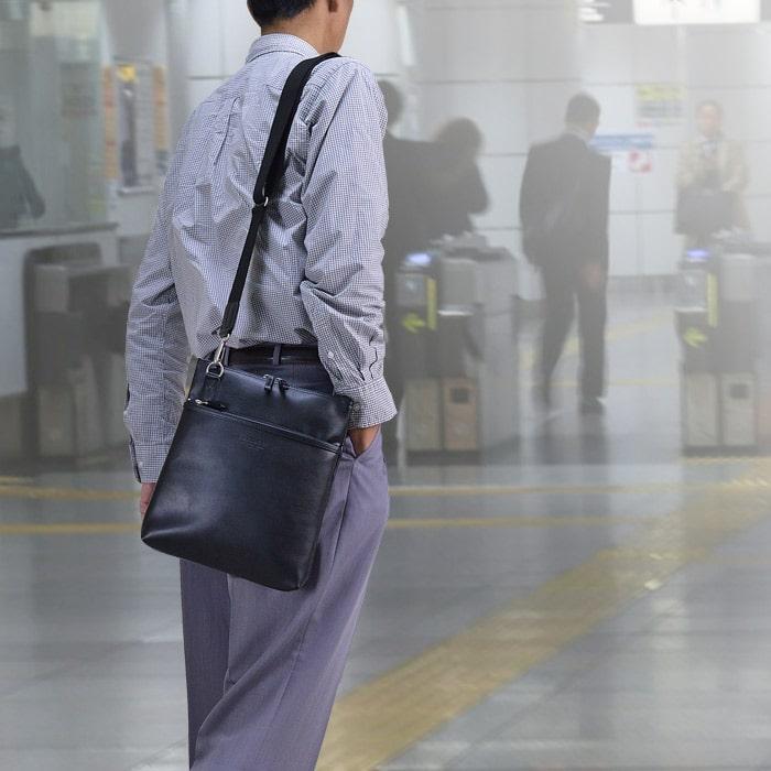 ◆ 薄マチでコンパクトサイズのショルダーバッグ。◆ 世代、男女問わず使いやすい薄マチでシンプルなデザイン。◆ B5サイズ対応でデイリーにもビジネスにも使える充実の収納力。◆ 丈夫で扱いやすい軽量合皮を使用。◆ 季節やシーンを関係なく使えるオールラウンダー。