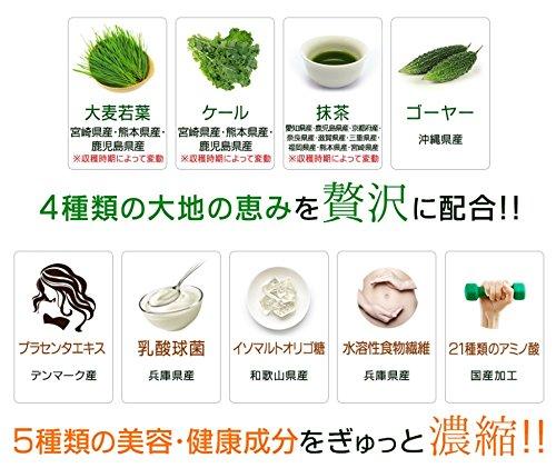 ※合成甘味料、着色料、香料、保存料、一切不使用?野菜不足を手軽に補える青汁 栄養豊富な大麦若葉・ケール・抹茶・ゴーヤを厳選配合し、毎日の健康をサポート。?美容&エイジングケアにプラセンタエキス配合 プラセンタエキスを配合し、美容と健康の両方をサポート!輝きをサポートします。?環境を整える乳酸菌・オリゴ糖・食物繊維をプラス 調子を整え、スッキリ快調な毎日へ。美容と健康の土台作りに最適!?まろやかな抹茶風味で美味しく飲める クセが少なく飲みやすい抹茶風味で、水・牛乳・豆乳に溶かして手軽に摂取可能。? 持ち運びに便利なスティックタイプ(3g/1包) 個包装だから外出先でも簡単に飲める!忙しい方でも続けやすい青汁習慣♪?国内GMP認定工場で製造・無添加で安心 合成甘味料・着色料・保存料不使用。国内の厳しい品質管理のもと製造し、安心してお召し上がりいただけます。?1包あたりの主要成分 大麦若葉末(九州産)/450mg ケール末(国産)/270mg 抹茶末(国産)/150mg ゴーヤ末(沖縄産)/50mg 水溶性食物繊維/10mg イソマルトオリゴ糖/10mg 乳酸菌死菌体/1mg プラセンタエキス末(豚由来)/9mg アミノ酸/1mg【免責事項】メーカーによる商品リニューアルに伴いパッケージ(内容量も含む)変更が行われた場合、新パッケージでお届け致します事ご了承願います。