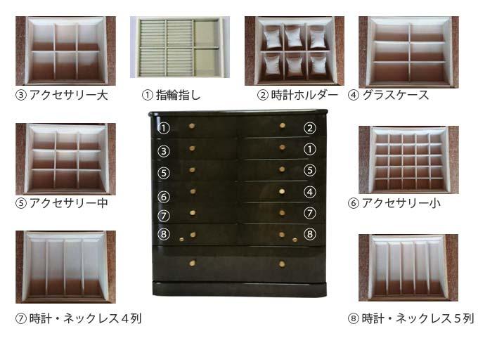 引き出し内部はジュエリー等の収納を考え、布貼り仕上げとなっております。指輪・ネックレス・リストウオッチ・アクセサリー等、収納を美しく見せ、整理収納できるよう仕切り板を施し、引き出しによっても仕切りレイアウトを変化させています。