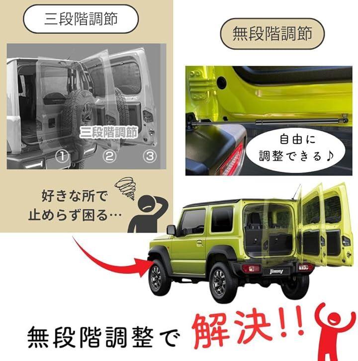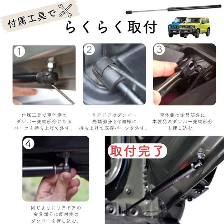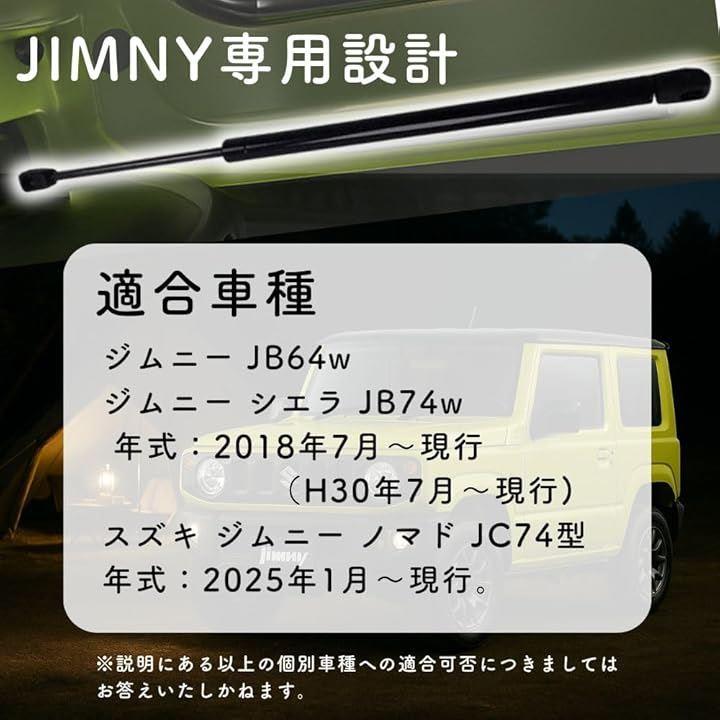 「対応車種&セット内容」 本製品は、スズキ ジムニー JB64W(2018年7月~現行)、ジムニーシエラ JB74W(2018年7月~現行)、ジムニーノマド JC74W型(2025年~)に対応したバックドアダンパーです。