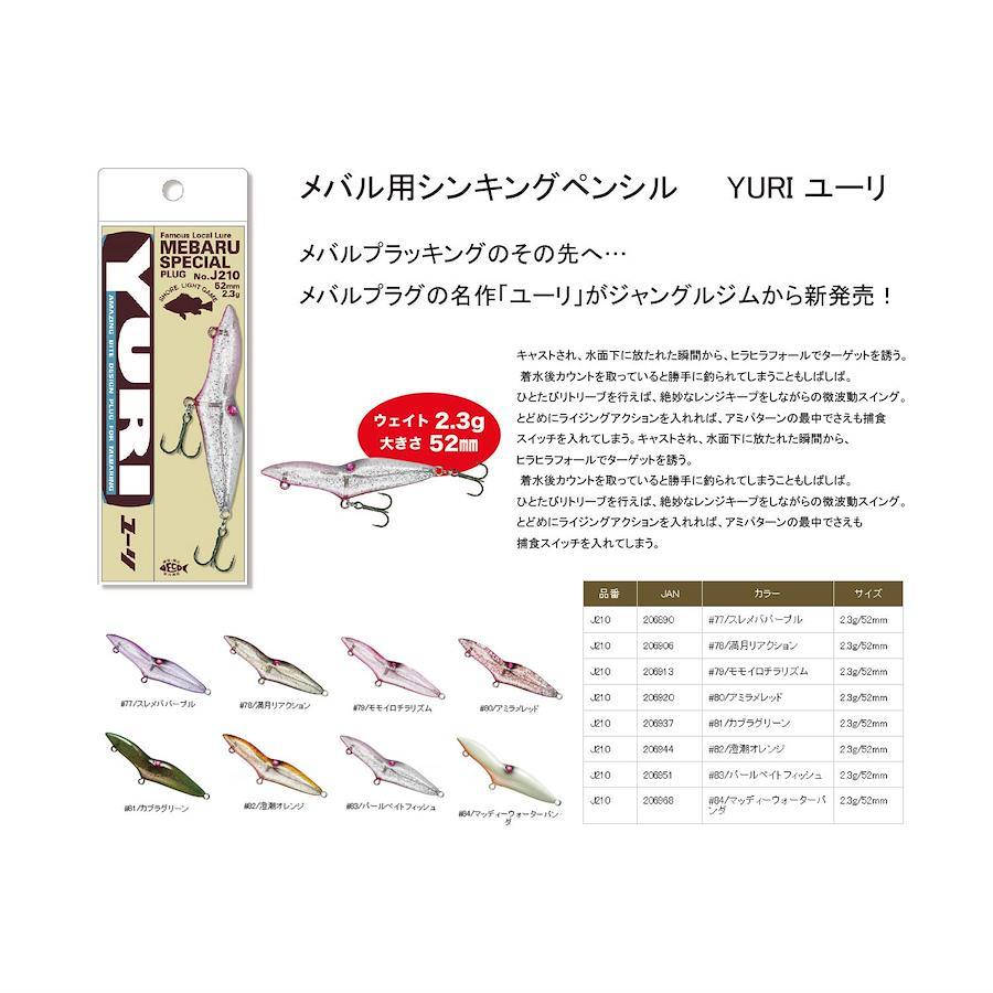 メバルプラッキングのその先へ…メバルプラグの名作「ユーリ」がジャングルジムから新発売! キャストされ、水面下に放たれた瞬間から、ヒラヒラフォールでターゲットを誘う。着水後カウントを取っていると勝手に釣られてしまうこともしばしば。ひとたびリトリーブを行なえば、絶妙なレンジキープをしながらの微波動スイング。とどめにライジングアクションを入れれば、アミパターンの最中でさえも捕食スイッチを入れてしまう。