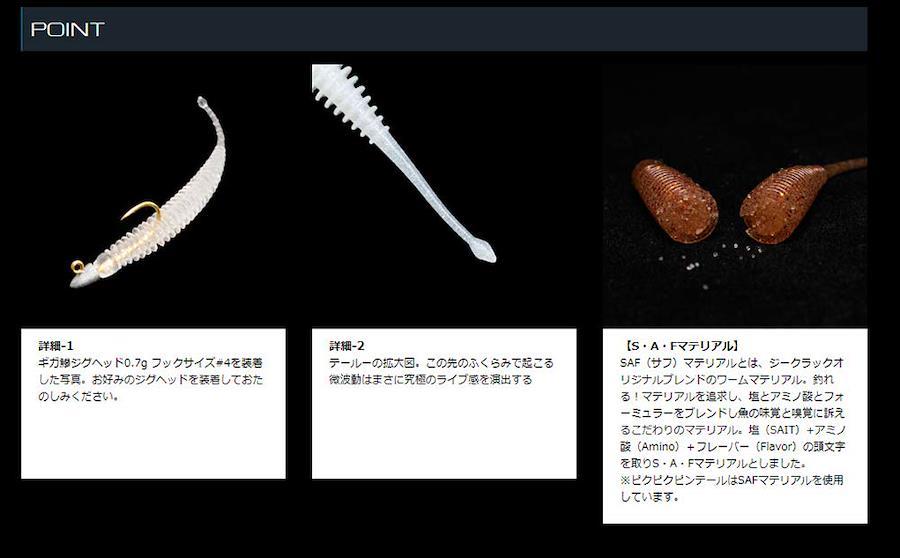 オリジナルソフトマテリアルを使用したアジ専用ワーム。マテリアルをSAFマテリアルに一新しました。匂いにはにんにくをプラスした海老ニンニクフレーバーでさらに釣れ釣れ!ボディーは水かみの良いリング形状でテールの先にほんの少しだけ膨らみを付けることによって起こる微波動はまさに究極のライブ感を演出し魚をスレさせない。ボディーは食い込みやすいようバルキー過ぎることなく細すぎない扱いやすいボリューム。吸い込みやすいソフトなマテリアルがしっかりとフッキングをサポートする。