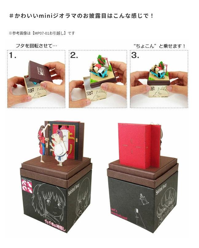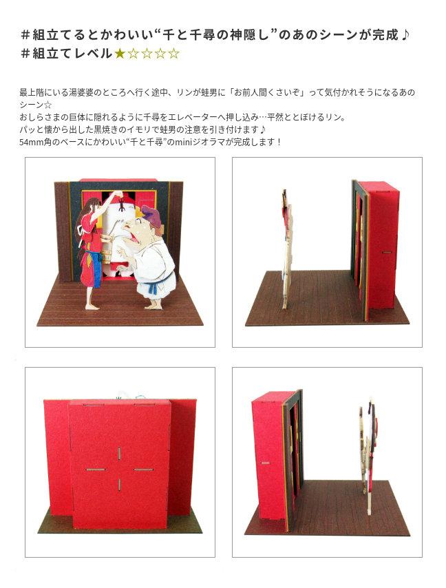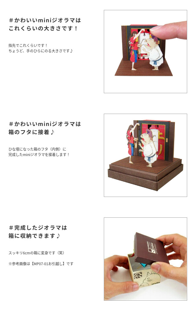 スタジオジブリminiは1辺6cmの箱の上に小さなジオラマが作れるペーパーキットです♪完成すると「千と千尋の神隠し」の世界がコマ送りのようにお楽しみいただけます☆ ※こちらの商品は組立てペーパーキットです。完成品ではございませんのでご注意ください。■商品名 スタジオジブリmini 千と千尋の神隠し リンと蛙男とおしらさま■コピーライト © 2001 Studio Ghibli - NDDTM Ghibli - NH■セット内容 レーザーシートA~N(14枚)、ベース(1枚)、組み立て説明書■スケール Non-scale■サイズ W60×D60×H60(107)mm ※内はジオラマを乗せた時の寸法です■対象年齢 12才以上■組立て所要時間 2時間~■組立てレベル ★☆☆☆☆■みにちゅあーとキットとは? ミニチュア制作の経験のない方でも、扱いやすい“紙” 素材で出来たECOペーパーキットです。製作道具はカッターナイフ、ピンセット、接着剤、定規、カラーペンなどがあれば作れますよ~♪