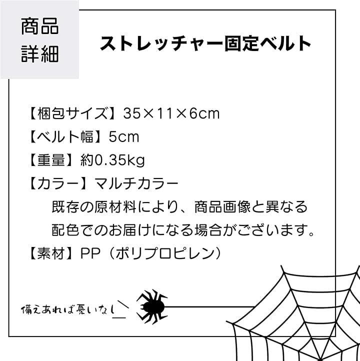 「商品内容」: ストレッチャー固定ベルト「梱包サイズ」35x11x6cm「ベルト幅」5cm「重量」約0.35kg「カラー」マルチカラー「素材」PP(ポリプロピレン)*既存の原材料により、商品画像と異なる配色でのお届けになる場合がございます。