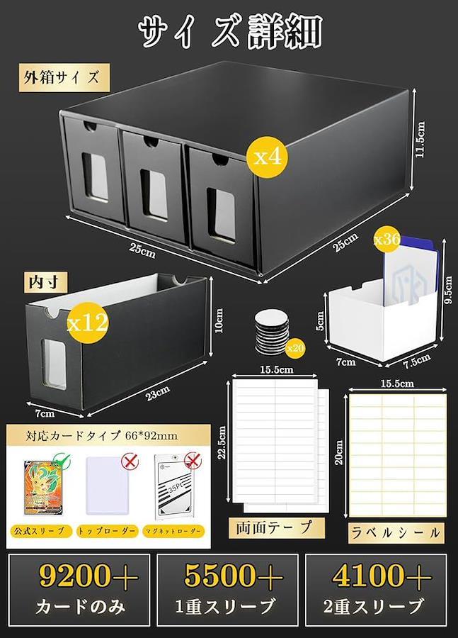 「大容量トレカ 収納&組立簡単」スリーブ有無やカードの厚みによって収納枚数は変動しますが、三層で約6900枚以上、四層で約9200枚以上の目安容量を確保。