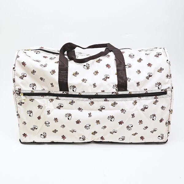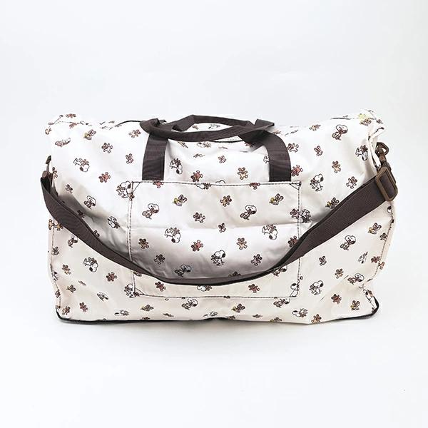 スヌーピーの普段使いから旅行用まで、幅広く使える軽いボストンバッグです♪容量約38LでスーツケースSサイズと同等の容量です。約1~3泊のご旅行におすすめ。使わないときはコンパクトに折りたたんで収納し、使いたいときにぱっと広げて使えます。バッグ背面にはスーツケースのキャリーバーに通せるようにキャリーバー通しが付いているので、旅行の際はとっても便利。バッグの開口部はファスナーで閉じられるので中身がこぼれる心配がありません。バッグ前面と側面にはポケットもついているので、小物を収納するのに便利です。さらに内装にもポケットが付いています。また、取り外し可能なショルダーベルト付きなので、肩に掛けて持ち運ぶこともできます☆彡