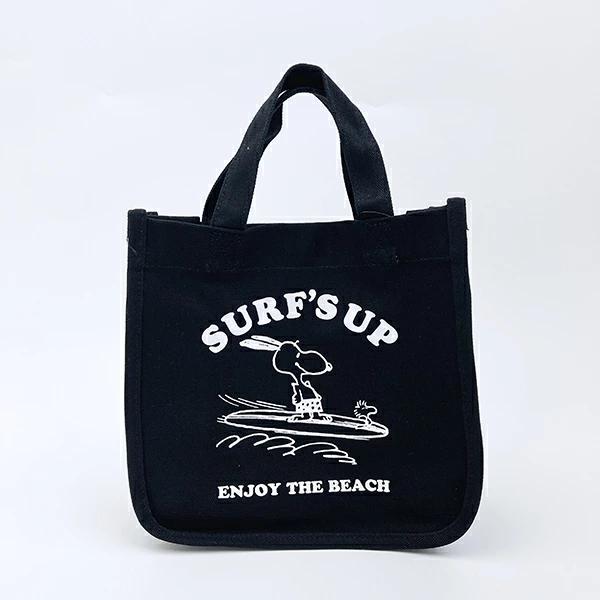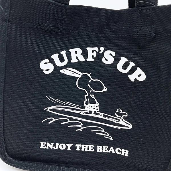 サーフィンを楽しんでいるスヌーピーのデザインが可愛いバッグです! 腕に引っ掛けて持つことが出来る長さの持ち手があります。マチがあるのでランチバッグとしても使っていただけます。様々な大きさのポケットがあるので、小物や500mlのペットボトルも入れられるのも便利! 落ち着いている色味でどなたにも使っていただけます♪ ちょっとコンビニへ・・のようなちょこっと外出にもよさそう◎ マグネットボタンもあるので安心です!