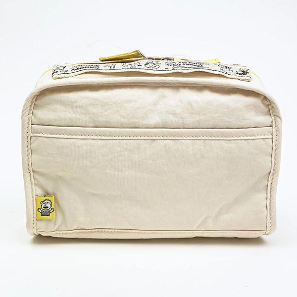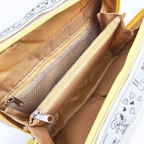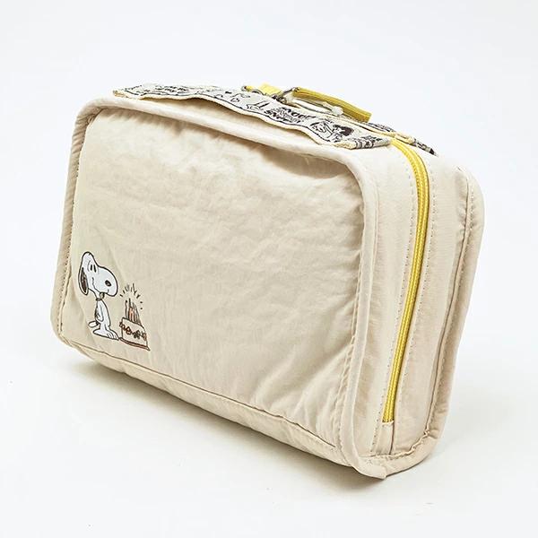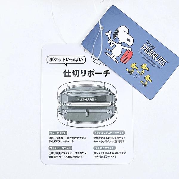 スヌーピーのポケットがいっぱいのポーチにです。仕切りがたくさんあり、旅行に大活躍!通帳・パスポートが収納できるサイズのフリーポケット、カードや小物入れに便利なメッシュポケット、貴重品やカード入れに便利なファスナーポケット、ガジェット用品を収納しやすいマチ付きポケット×2があります。取っ手付きで持ち運びも便利♪