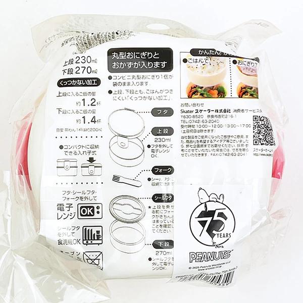 小さな丸型のシンプル2段お弁当箱です♪コンビニの丸型おにぎり1個が袋のまますっぽり入り、上段下段とも、ごはんがつきにくい「くっつかない加工」が施されています。内蓋収納フォーク(プラスチック製)付き。食べ終われば1段にコンパクトに収納できます!※ロック式ですが、パッキンは付いていませんので汁気のある食材はお避け下さい。フタ・シールフタ・フォークを外して電子レンジOK!食洗機使用不可となっております。【容量】上段230ml/下段270ml