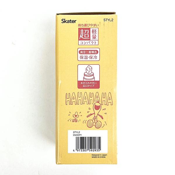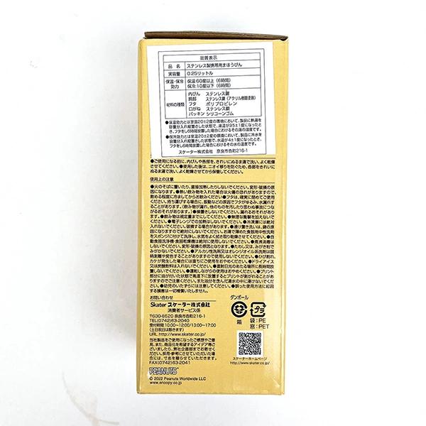 スヌーピーのコンパクトサイズの直飲み水筒です。保冷保温ができるステンレス真空二重構造。氷が入れやすい広口タイプ。持ち歩きやすい重さなので、ちょっとしたお出かけや就寝時に枕元に置いておくのにもピッタリ◎【商品サイズ(約):直径5.8×高さ14.3cm】【容量:250ml】【重量:110g】【保温効力:60度以上(6時間)保冷効力:10度以下(6時間)】※自動食器洗浄機・食器乾燥機は絶対に使用しないでください。※熱い飲み物を入れた場合は火傷の恐れがありますので、飲める程度に冷ましてからお飲みください。