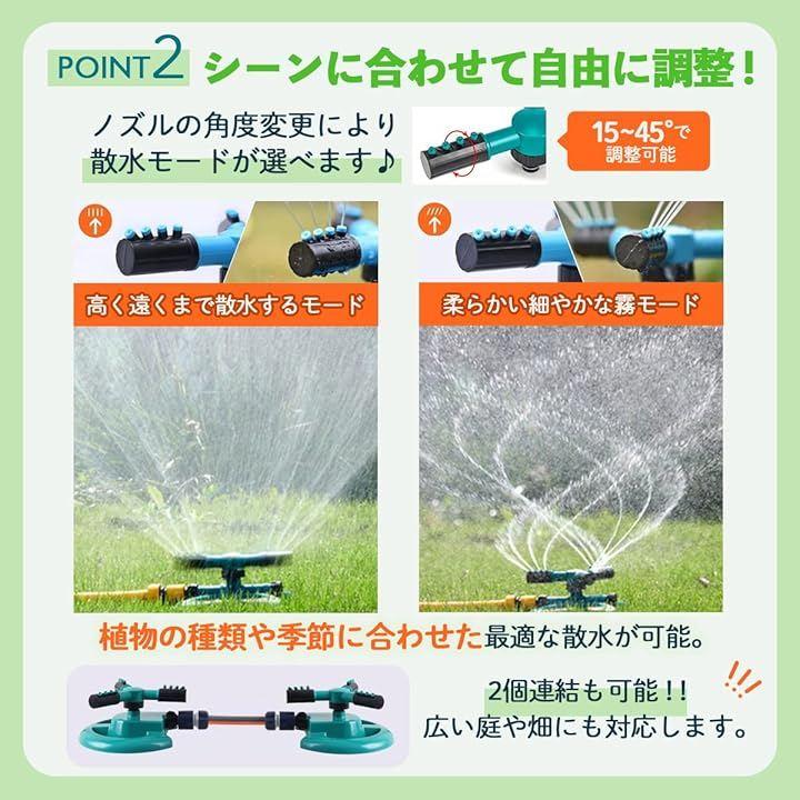「高性能360度回転散水で庭全体を均一に潤す」 360度回転機能により、庭や花壇、芝生の隅々までムラなく水を届けることができ、家庭菜園や庭園の水やり作業を効率化します。