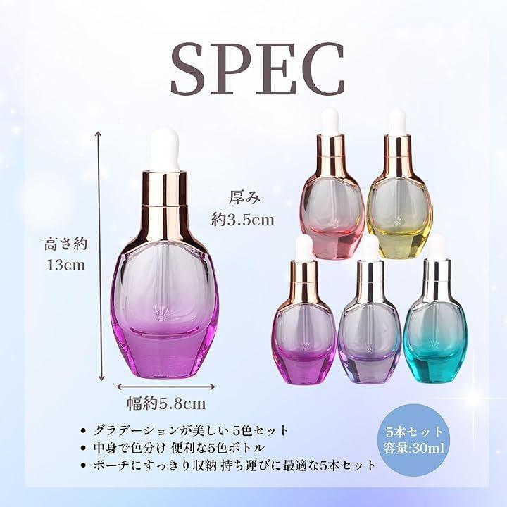 サイズとセット内容:高さ約13cm 幅約5.8cm 厚み約3.5cm 30ml 保存容器5本 材質:ガラス、PP
